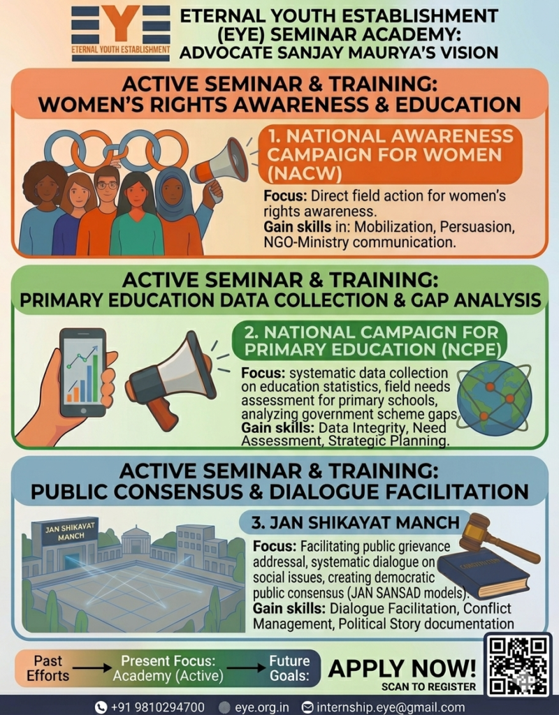 We are pleased to invite your students to a transformative seminar hosted by Eternal Youth Establishment (EYE), led by Advocate Sanjay Maurya.